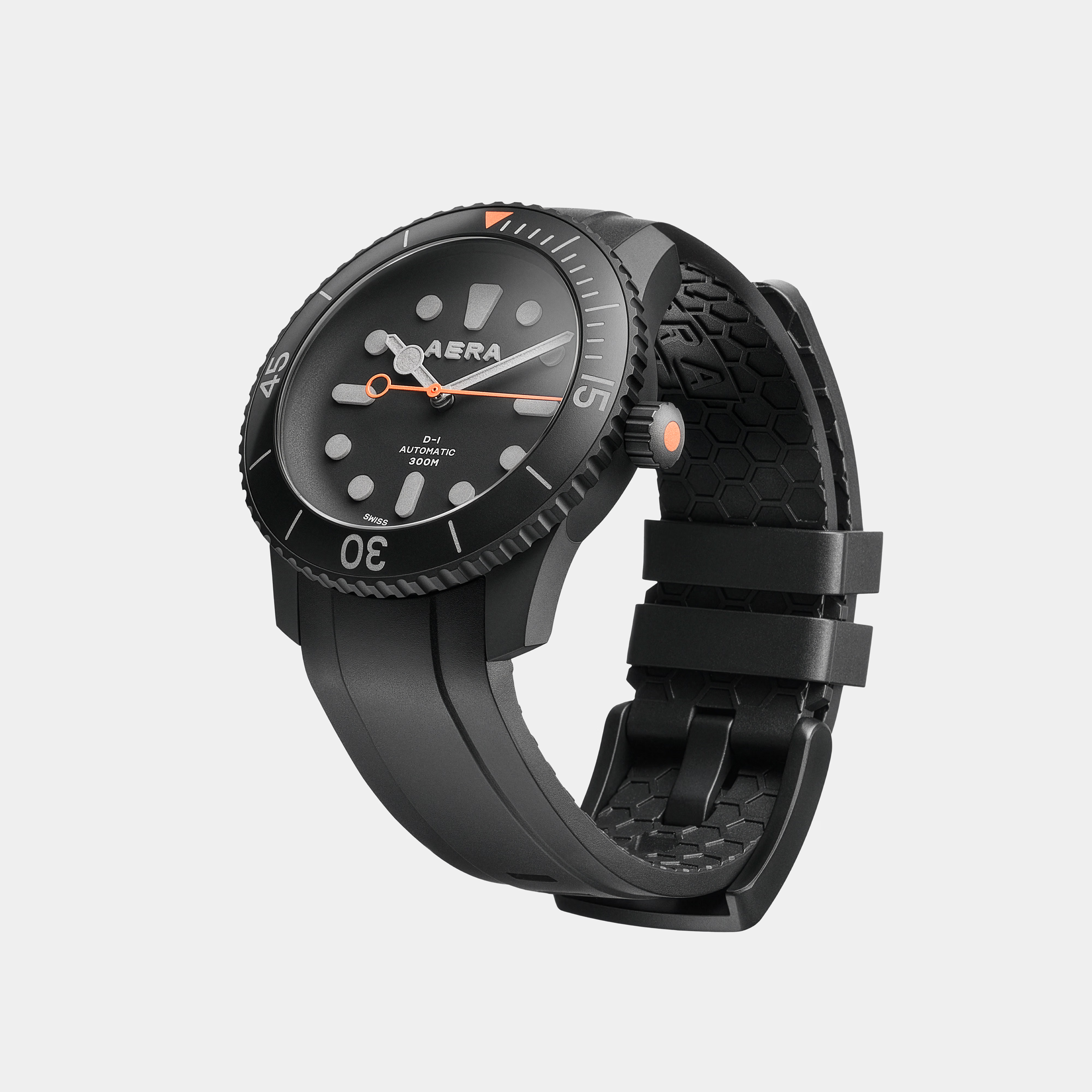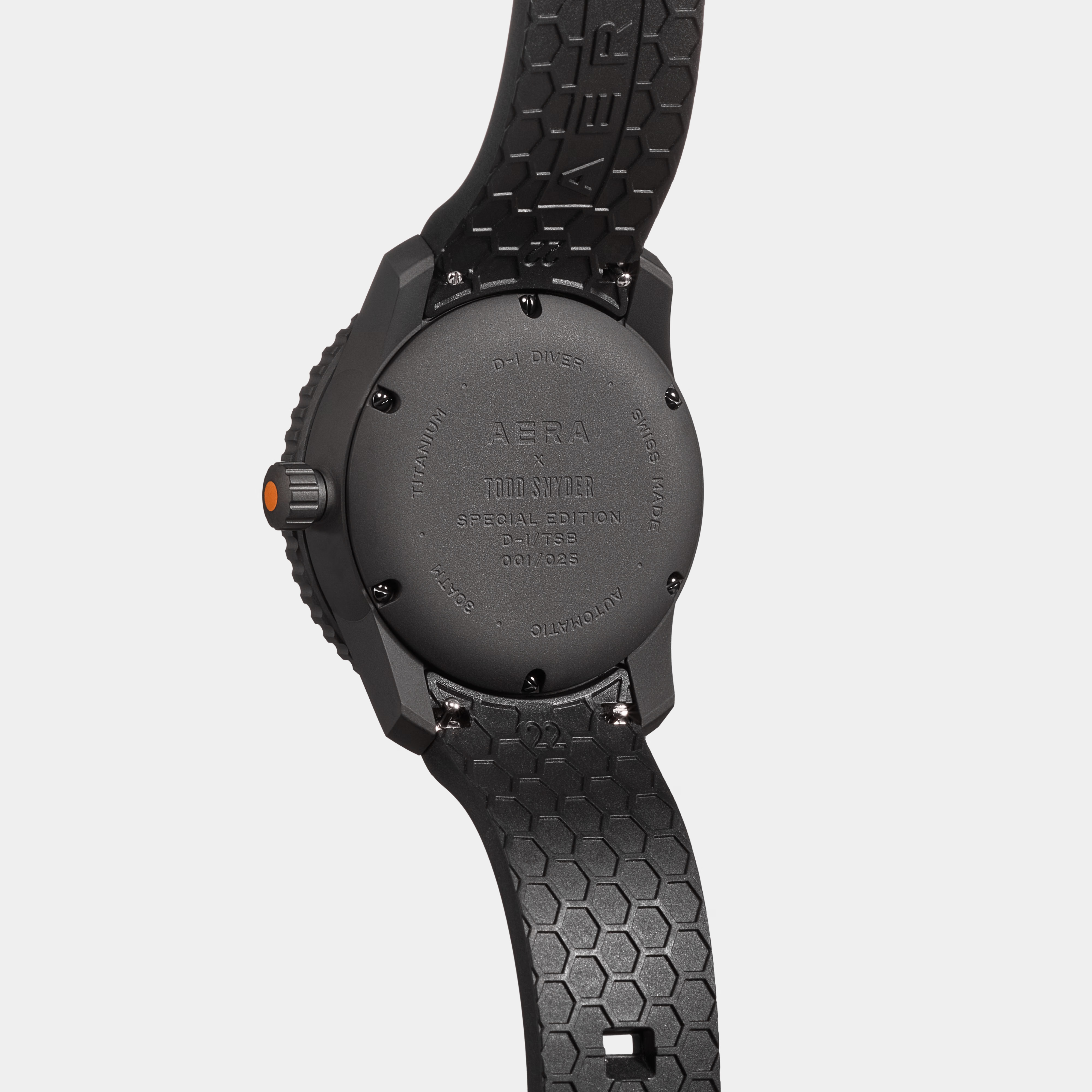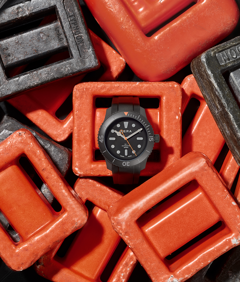 Limited to only 25 units, the D-1 Diver’ Titanium case, bezel and case back are coated with matt black Diamond-Like Carbon (DLC) giving it robustness and lightness while adding scratch resistance. This edition retains the signature one-piece dial, domed glass and Swiss automatic movement of the original D-1. Always striving for improvement, however, we refined the case shape for comfort on the wrist and added 3D Aera logo and hour markers in Swiss Super-LumiNova. Orange accents pop against the dark tonal watch face, and in low-light conditions, the Super-LumiNova® on the markers, numbers and hands glow green for visibility. Legibility, both day and night, are a must for this quintessential tool watch. The versatile D-1 Blackout is more than capable as a tool for deep dives, but it’s just as at home on dry land.
