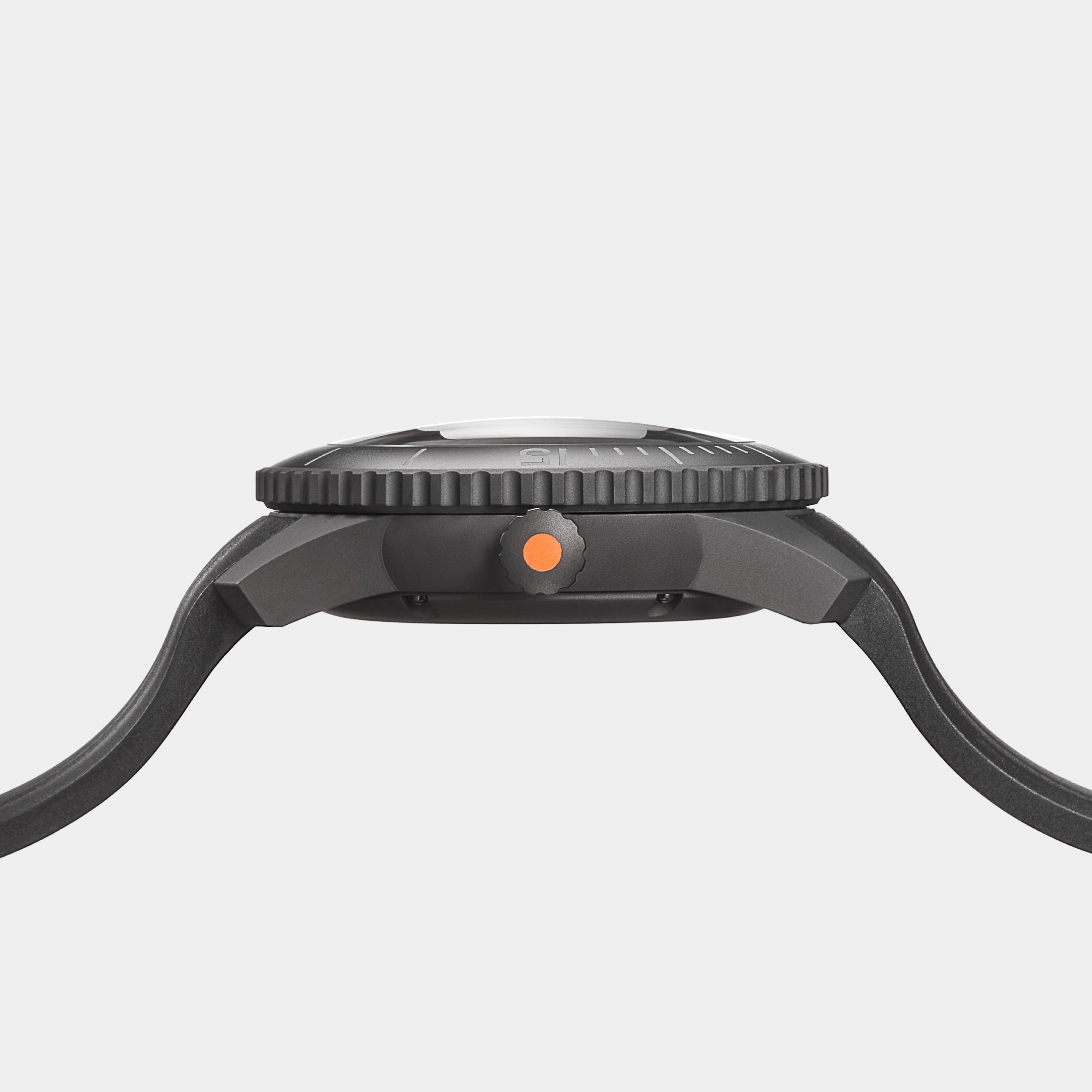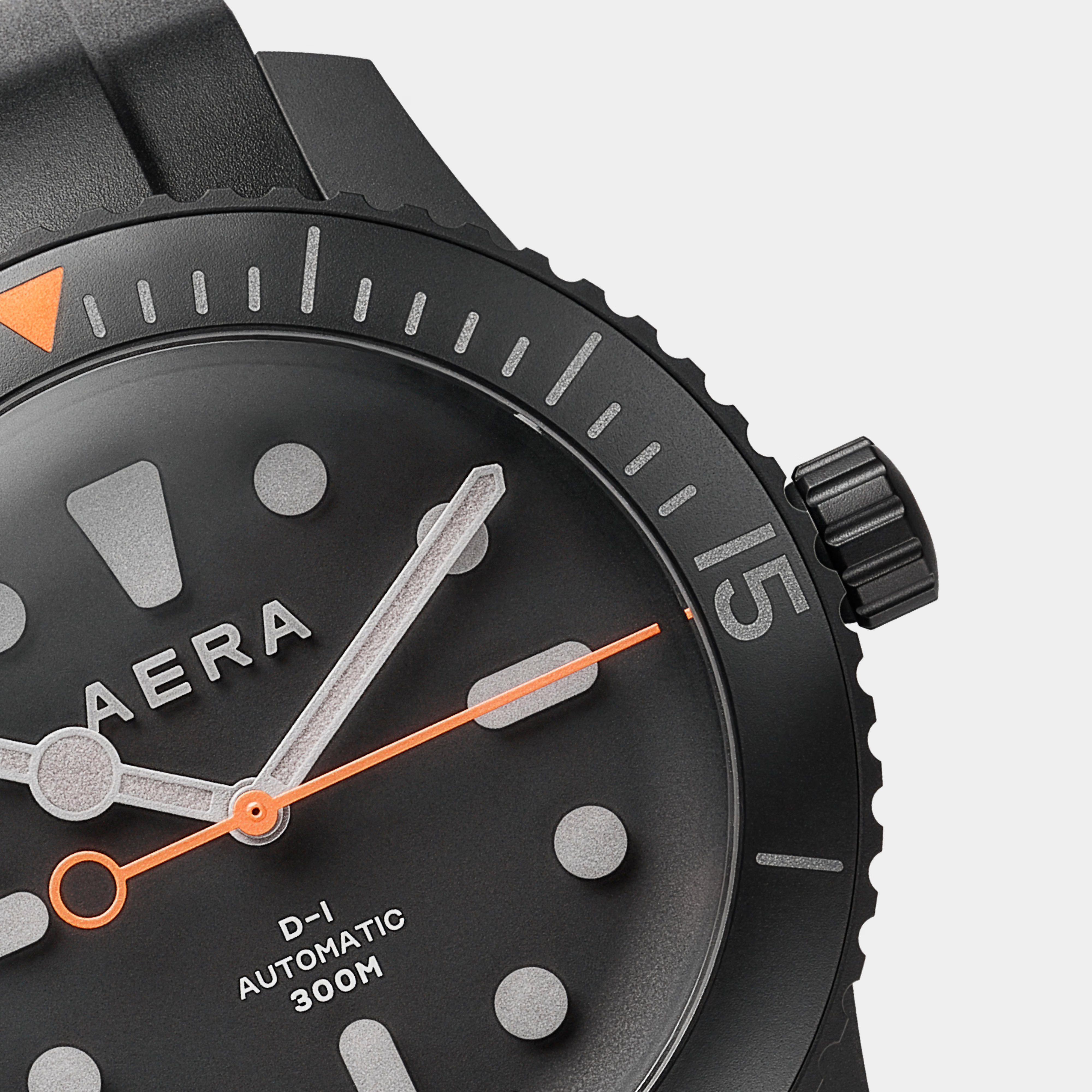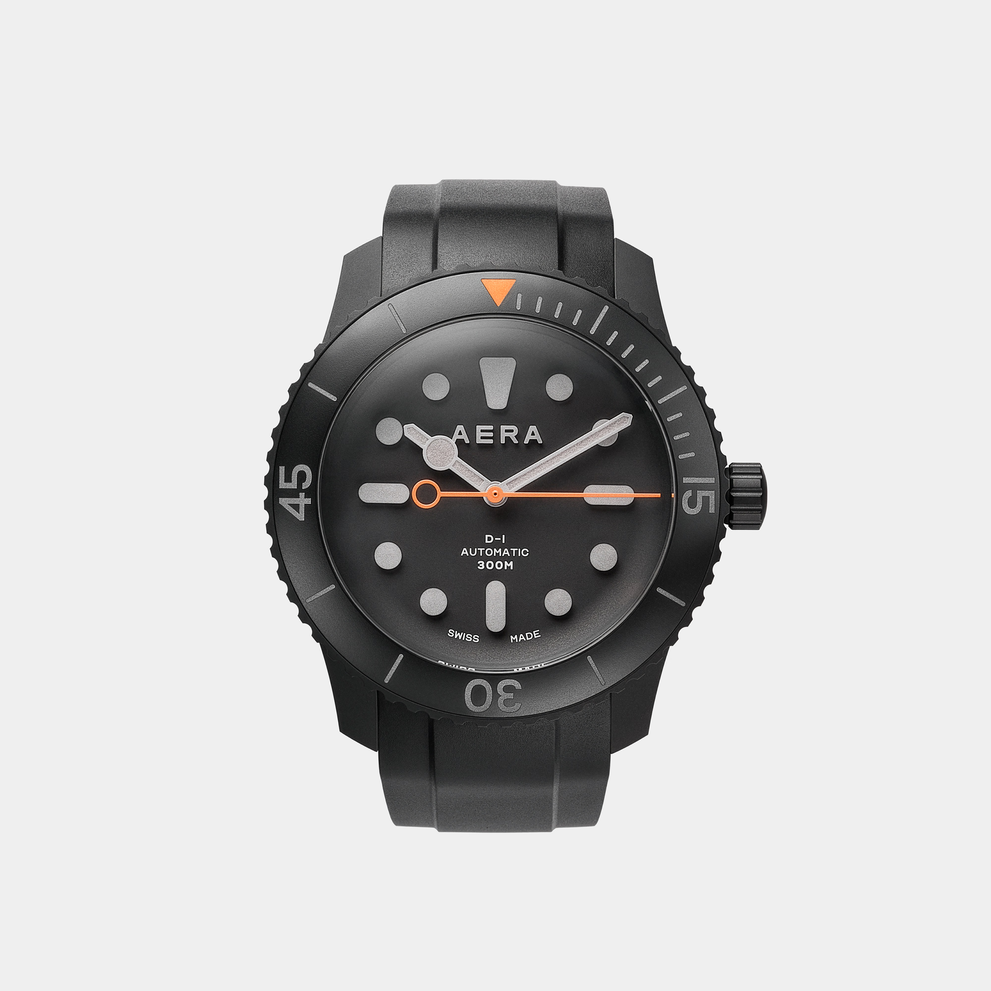 Limited to only 25 units, the D-1 Diver’ Titanium case, bezel and case back are coated with matt black Diamond-Like Carbon (DLC) giving it robustness and lightness while adding scratch resistance. This edition retains the signature one-piece dial, domed glass and Swiss automatic movement of the original D-1. Always striving for improvement, however, we refined the case shape for comfort on the wrist and added 3D Aera logo and hour markers in Swiss Super-LumiNova. Orange accents pop against the dark tonal watch face, and in low-light conditions, the Super-LumiNova® on the markers, numbers and hands glow green for visibility. Legibility, both day and night, are a must for this quintessential tool watch. The versatile D-1 Blackout is more than capable as a tool for deep dives, but it’s just as at home on dry land.
