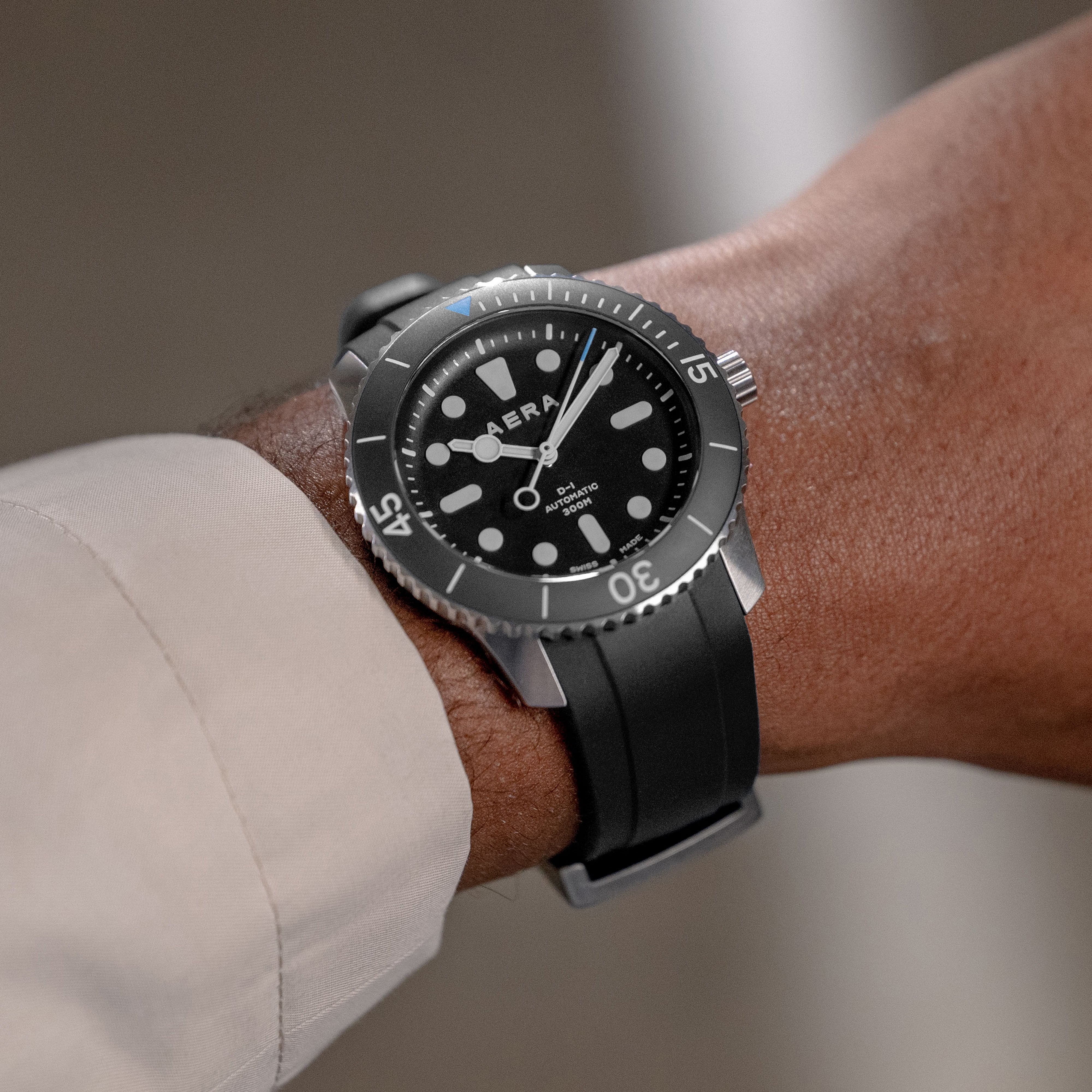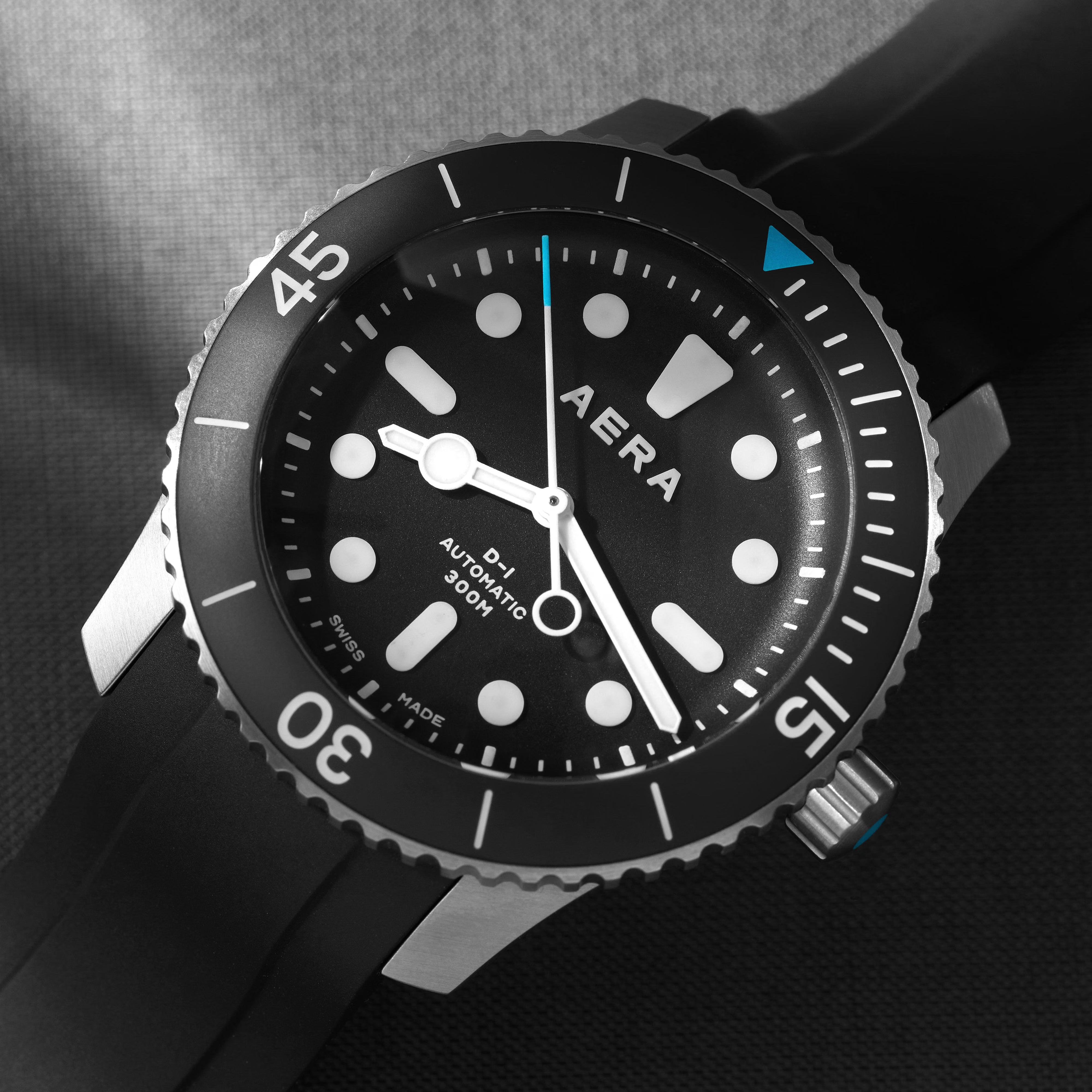 Its brushed finish perfectly complements the unidirectional satin-finished ceramic bezel, which rotates with a satisfying ‘click’. If you’re counting, a full rotation takes precisely 120 clicks. Diving watches have long been appreciated for their functionality and rugged appeal. The D-1 is no different. It’s more than capable of being used as a tool for regular deep dives, but it’s just as at home under a shirt cuff on dry land. It comes with a 300m water resistance, which is further improved thanks to the new case back, secured with six visible screws for a utilitarian look. Available in an edition of 300, every purchase features our Scuba Black rubber strap as well as an additional strap, which can be chosen from a pre-selected range. These come with our quick release mechanism, so you can change the look of the D-1 on the fly, wherever the mood takes you.